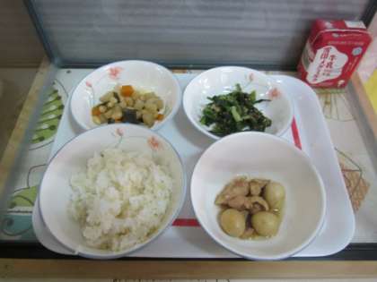 今日の給食は,玄米ご飯・牛乳・鶏肉のさっぱり煮・小松菜の胡麻いため・五目煮豆です。