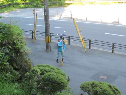 ひんやりとした石段付近から【朝の門掃き】が始まります。