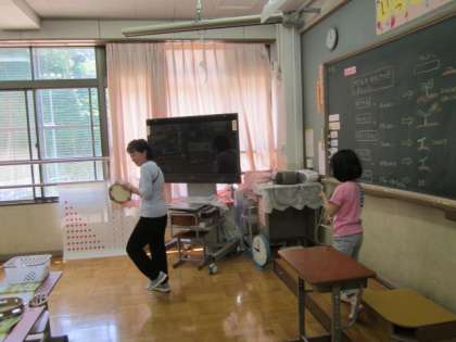 音楽に合わせて,(トライアングルを鳴らしながら)行進しています。
