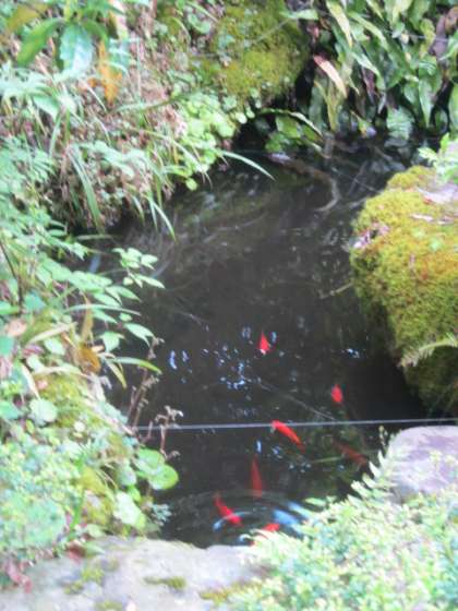石段上の池では,金魚が元気に泳いでいました。
