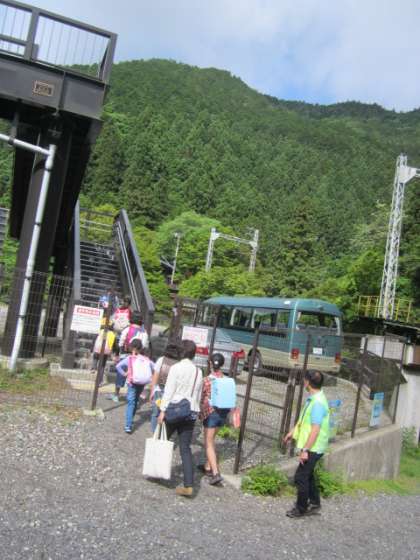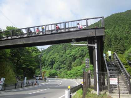 歩道橋の下からは,給食調理員さんが鞍馬っ子に