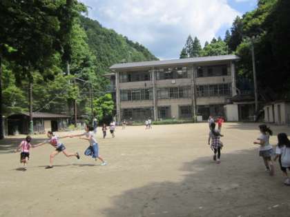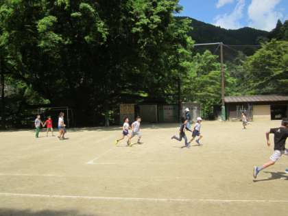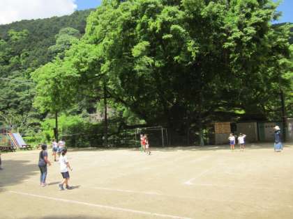 手つなぎ鬼を楽しんでいます。だんだん気温が上がってきました。
