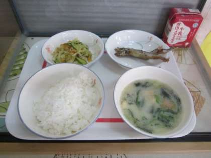 今日の給食は,ごはん・牛乳・ししゃものから揚げ・野菜の梅おかか・豆乳のみそ汁です。