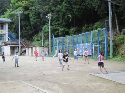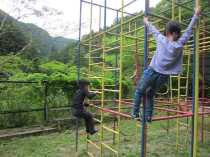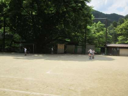 いろんな遊びを楽しんでいます。6年生に一輪車を教わる鞍馬っ子がいました。
