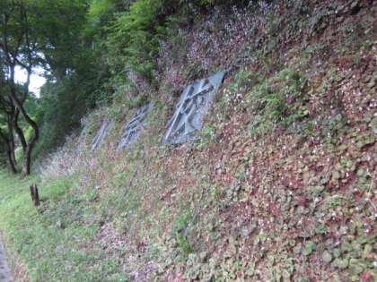 学校の石垣に設置されているプレートの周りに,今年もユキノシタの花が咲き始めてきました。