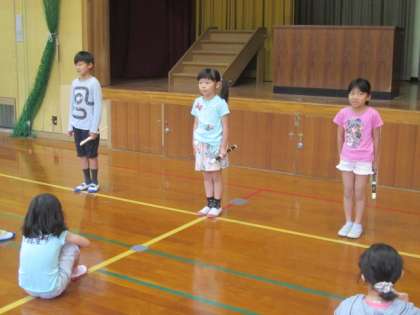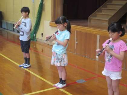 朝会の後はフレッシュタイムです。今日は3年生の発表です。京都の通り名を東西・南北とも歌いました。「丸・竹・夷・二・・・・」はわりと知っている人もいると思いますが,「寺・御幸・麩屋・富・・・」はあまり知られていないようです。よく覚えて発表できました。次のリコーダー演奏も,覚えたてのリコーダーを一生懸命演奏しました。緊張もしたと思いますが,立派な発表で,みんなから大きな拍手ももらえました。