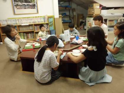 給食は総合学習室でいただきました。家族の団らんのようですね・・・。