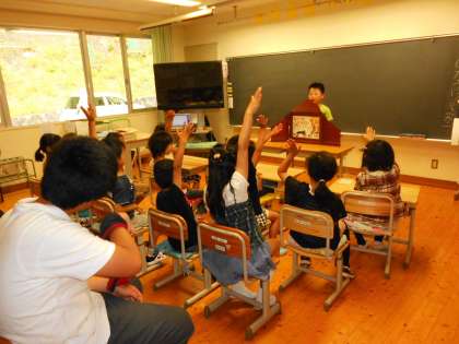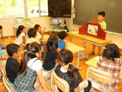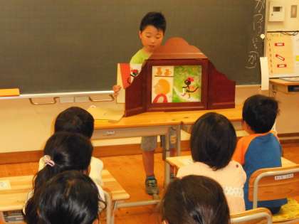 今日のお話は有名な「ながぐつをはいたねこ」。「テレビで見たことある。」という子どももたくさんいましたが,テレビとはひと味違う紙芝居の世界を楽しみました。上手に声色を変えたり場面が一気に変わるようにページをすばやくめくったりと工夫しながら読んでくれたので,子どもたちも紙芝居のおもしろさに触れることができました。読み終えた後の感想では「こんなネコがほしいです。」という感想も。はじめは役に立たないと思われていたネコが頭を使って素晴らしい活躍をし粉屋の息子をお姫様のお婿さんにするというサクセスストーリーには,この物語が長い間世界中の人に読み継がれてきた魅力があるのです。