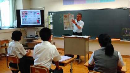 昨年度の復習から現代の“解釈”の問題まで、小学生新聞などを活用してわかりやすく説明がありました。最後に「違って当たり前、違いを受け入れる」という中学生の作文を読んで、見方を変える大切さから明日からの修学旅行の心構えにまでつなげてくれました。