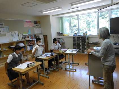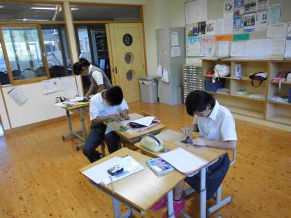 今日の6時間目は、事前取組の最終確認を行い、3日目に行う英語インタビューで、受けてくれた外国の方に渡す「お礼の押し花のしおり」をつくりました。