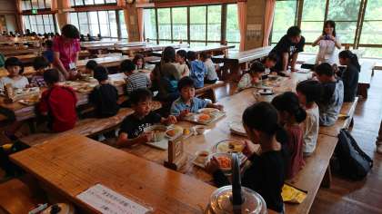 2日目の昼食をいただきました。午前のプログラムを終えて,みんなお腹が空いているようです。花背山の家の食堂で食べる最後の食事を楽しんでいました。