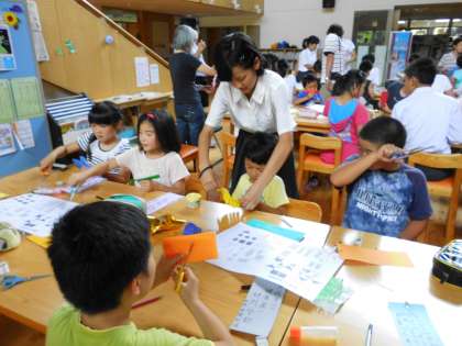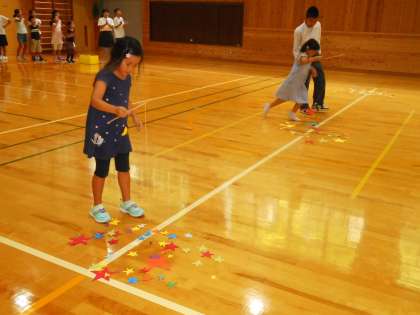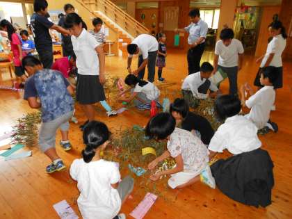 児生会主催の「七夕集会」が開かれました。はじめに体育館で,七夕にちなんで星つり遊びをしました。その後,みんなのリビングで願い事を短冊に書いたり,笹飾りを作ったりしました。作り方が分からない1年生にも中学生が優しく教えてくれて,すてきな七夕の笹が出来上がりました。