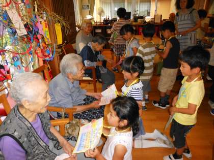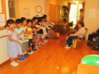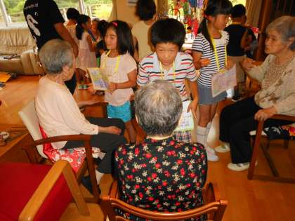 花友はなせを1期で訪問しました。音楽で学習してきたことの発表をした後,自己紹介カードを使って1人1人のお年寄りの方とお話をすることができました。「また秋に来ます。」と4年生が終わりの言葉を言うと「楽しみにしてます。」と言葉を返していただけて,次回の訪問も楽しみになりました。学校に戻ってからのまとめでは「戦争のときのことを話してもらって戦争は悲しいと思いました。」「昔は家で牛を飼っていたと言ってはったので,くらしが変わってきたのだと分かりました。」「昔は,お手玉など手作りのおもちゃで遊んでいたと分かりました。」など,しっかりお話ができていたことがうかがえました。