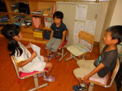 昨日の別所探検で見つけた夏の中から,自分のとっておきを選んでカードにかき,それを紹介しました。相手を変えて何度もやりとりするうちに紹介の仕方も感想や質問の仕方も上手になっていきました。1年生も2年生の話し方を真似て,さらに相手に伝わる話し方を身につけることができました。