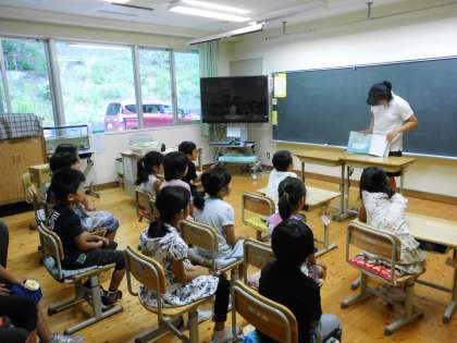 2回めと3回めの読み聞かせは,どちらも犬が主人公のお話でした。本が大好きで本屋を始めたいぬくんの「ほんやのいぬくん」。お客さんは来ないけど本の世界を楽しんでいるいぬくんの様子に思わずほほえみが浮かびます。もう1冊は「星空のシロ」という実話の絵本でした。実験犬として傷を負ったシロは,世話係のおじさんとさやかさんに助けられ次第に体を回復していきますが,最後には車にひかれて死んでしまいます。生き物の命について考える1冊でした。