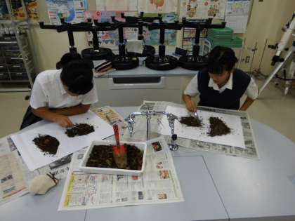 本日の5・6時間目の理科で、土の中の食物連鎖(食物網)を学びました。教材は学校周辺の土を用いました。これを花背に由来する教材で花背教材といいます。
