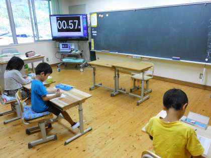 夏休み明けから取り組んできた計算練習。やるごとにタイムが縮まって「速くなった!」と毎回意欲的に取り組んできた1年生。今日はその成果を発揮して第2回計算大会に取り組みました。前回は50問5分でしたが今回は同じ問題を3分で解きます。みんなタイマーの合図で真剣に計算に向かい,どんどん答えを書き込んでいきました。終わったとたん「もっとやりたい!」と大きな声が上がり,やる気の高さがうかがえます。次回第3回計算大会は今学習しているくり上がり・くり下がりのある問題50問5分です。さらに計算力が身につくようにがんばりましょう。