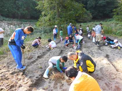 今日は全校でおいもほり。「誰が一番大きないもを掘るかな?」とみんなの意欲を高めるためにリーダーが上手に言葉をかけてくれて,意欲満々で掘りました。獣にやられて心配していましたが,土の中から大きないもが次々出てきて,「これで井戸端展は大丈夫。」と子どもたちも安心しました。花背小中学校のおいしい安納芋の焼き芋を別所井戸端展で是非ご賞味ください。