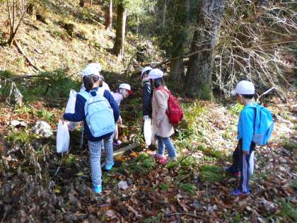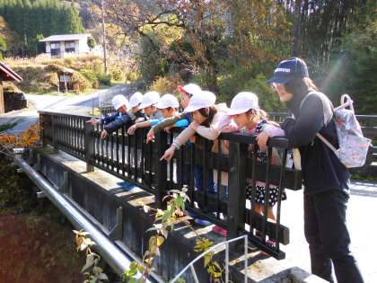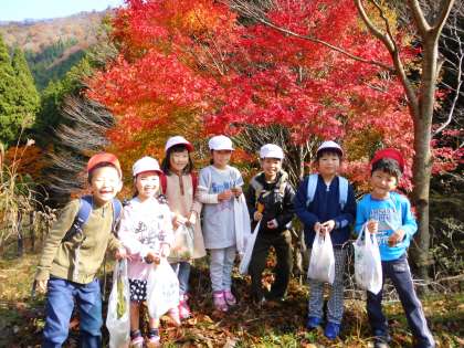 1,2年生で別所に秋を見つけにいきました。きれいな落ち葉,色づく山々,くりなどの木の実・・・たくさんの秋を見つけることができました。最後は「落ちてくるはっぱをつかまえろ!」と風が吹くたびに舞い落ちる葉を手でつかまえる遊びをして楽しみました。