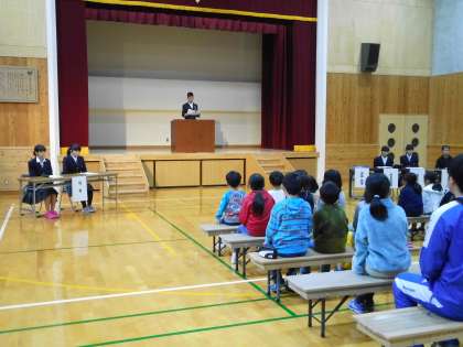 新しい児生会の役員を選ぶ選挙がありました。立ち会い演説会で,立候補者からどんな児生会にしていきたいのか考えを聞き,選びます。どの立候補者も壇上で緊張することなくしっかり自分の考えを発表していて,今までの伝統が生かされていると思いました。初めての1年生や転校生も,書き方を教えてもらって,大事な1票を投票箱に入れました。新しい児生会でさらに良い学校になるように,33人力を合わせてがんばりましょう。