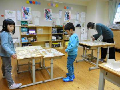 1年生がしている百人一首に,今日は学校司書の先生が参加してくださいました。小学校・中学校で百人一首クラブに入っていた先生なので,上の句を読んだだけで下の句をどんどん取っていきます。でも,1年生には「2人組」「5色」という強い味方がついています。色を見ない1人の学校司書の先生に無事勝ち,来週全員がそろったら再度対決することをお約束して1回目の対決を終えました。子どもたちも終わりの会のスピーチで「学校司書の先生は,色を見ないでたくさんとって,すごかったです。」と感心して話していました。ありがとうございました。