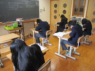 今日から第5回定期テストが始まりました。7・8年生は9教科を3日間で、6年生は国語・社会・算数・理科の4教科を2日間で、1〜5年生も国語・算数の2教科を2日間で取り組みます。写真は7年生のようすです。テストが始まると黙々と問題に取り組む姿がどの学年でも見られました。学年の締めくくりとなるテストです。がんばって下さい。