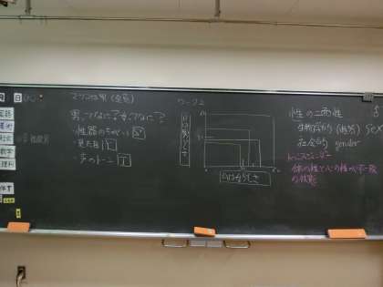 めあては社会的な性であるジェンダー(トランスジェンダー)です。これについて考えました。価値観が多様化する現代の中で直面する難しい内容で,自分の中での答えを探す授業でした。学んだことを将来につなげてほしいです。