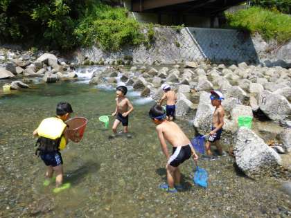 1,2年生で,春にも行った八桝の方へ夏見つけに行きました。旧八桝小学校で春と違う夏の季節を見つけた後,交流の森まで歩き,道ばたや畑の様子も観察しました。最後は交流の森の川で,川遊びをしました。ゴリやどじょうなどをたくさんつかまえて,楽しい川遊びになりました。残念ながら,作ったもんどりには1ぴきも魚が入らなかったので,学校にもどってからもう一度学校園の裏の川へ,もんどりをしかけに行きました。さあ明日誰のもんどりに魚が入っているでしょう。楽しみです。
