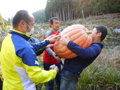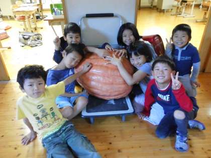 今年のハロウインでは自分たちで育てたカボチャでジャックオランタンを作ろうと1,2年生で春から育てたカボチャが,見事に大きく育ちました。力持ちの先生たちに手伝ってもらってやっと畑から学校に持ち帰ることができました。こんな大きなカボチャにびっくりの子どもたち。いったいどのくらいの重さがあるのでしょう。にっこり笑顔で写真に納まりました。
