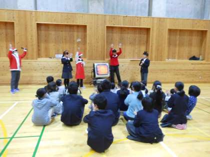 児生会本部主催のクリスマス会がレインボータイムに開かれました。セブン・イレブンじゃんけんやジェスチャーゲームをしました。ジェスチャーゲームには先生チームも参加し健闘しましたが伝言を送っていくのは難しかったです。新しい児生会体制になって初めての本部の企画で,全校で楽しい時間を過ごすことができました。