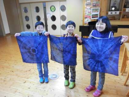 放課後,地域の方に教えていただいて前期課程の子どもたちが藍染めをしました。白い布を輪ゴムでくくって絞り模様が入るようにし,藍の染料の中に入れます。初めは緑だった布が空気に触れると濃い藍色に変わります。輪ゴムをとるとおもしろい模様が入った大きなハンカチの出来上がりです。藍という植物が濃い色の染料となることを発見したのは誰だったのでしょう。昔の人の知恵に感心しますね。教えてくださった地域の方,お世話になってありがとうございました。
