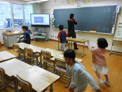 1年生にとって初めての英語活動がありました。ALTの先生の自己紹介を聞いたり,自己紹介の仕方を教えてもらったりした後,英語のゲームを楽しみました。2年生はさすがに2年目なので,上手にALTの先生とやりとりすることができ,1年生のお手本になってくれました。