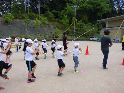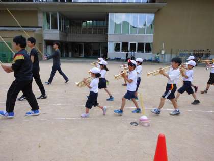 わくわくバンドで運動会の入場行進の練習をしました。演奏せずに歩き,場所を確認した後,実際に曲を演奏しながら歩いてみました。3色の3人でそろえて歩くのが難しいですが,1年生もしっかり歩けました。