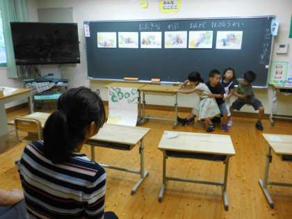 学習の最後に音読発表会をしました。今回も養護の先生や学校司書の先生をお招きして「おおきな かぶ」の音読を聞いていただきました。自分で考えたセリフを入れたり動きを工夫したりして,「上手にできたね。」とほめていただきました。