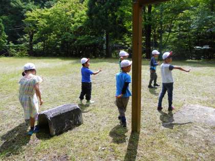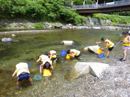 まだ梅雨はあけていませんが,1,2年生で夏みつけに行きました。春見つけでも行ったコースをたどり,春とは違う夏を次々と見つけていきました。最後は,交流の森で川遊び。作ったもんどりを仕掛けたり,水中めがねで川の中をのぞいて生きものを見つけたり,と楽しい夏みつけになりました。