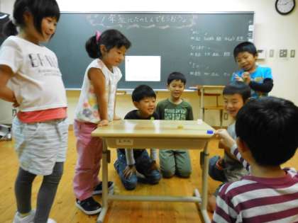1年生が2年生から遊びの招待を受けました。ペットボトルのキャップのおはじきや空き箱のミニゴルフ,廃材を積み上げて高さを競うなど,身の周りの物で楽しく遊べることがわかりました。ありがとう,2年生。