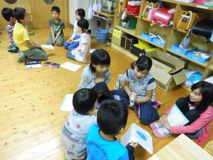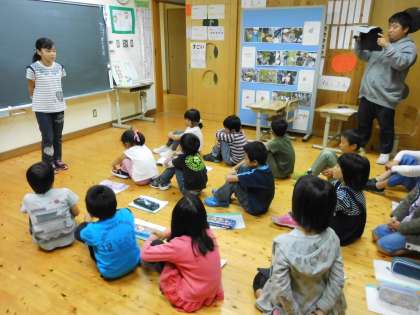 一期で集まって校外学習のふりかえりを行いました。クイズの答え合わせをしたり,それぞれの絵日記を紹介しあったりして,楽しかった校外学習を振り返りました。