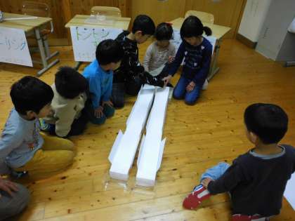 1年生は生活科で秋のものを使ったおもちゃを,2年生は廃材を使ったおもちゃを作りました。半日入学では,そのおもちゃで新1年生に学校の勉強は楽しいということを伝えようと「おもちゃラリー」を計画しました。今日はそのリハーサルを行いました。遊んだ後お互いに直した方がいいところや工夫した方がいいところなどアドバイスを送り合いました。「あんまり入らないから,もっと近くにした方が・・。」「大きさが違うとやりにくいから,大きさをそろえたら・・。」など,実際に遊んでみたら分かることなどアドバイスがどんどん出て,さらにおもちゃを改良することができました。いよいよ明日が本番です。新1年生が喜んでくれたらいいですね。