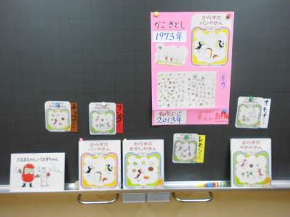 今日は2年生の先生の本の紹介がありました。みんながよく知っている「からすのぱんやさん」。「チョコちゃん」「りんごちゃん」「おもちちゃん」「れもんちゃん」の4人の名前もすらすら子どもたちから出てきます。でも,それから40年後,新しく4冊の本が出版されていたとは!4人それぞれ食べるもののお店を開いていたのです。2冊は学校図書館にあるそうですが,あとの2冊はすでに注文してもらっていますので,入るのが楽しみです。入ったら借りて読んでみて下さいね。