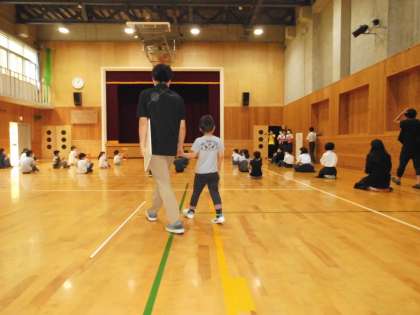 まず,拍手で迎えられながら体育館に入場し,椅子に座りました。そして,自己紹介を椅子から立ち上がり,行いました。