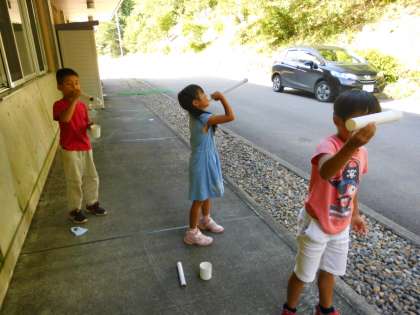 1学期から計画していた夏の遊び「しゃぼんだま」。せっけんをけずり,お湯に溶かし,ふくらみぐあいを確かめ,よくふくらむ石けん水を作りました。吹いたり風を通したりしてしゃぼんだまを作りました。数を比べたり大きさを比べたり,ふくらませたしゃぼんだまを友だち同士でつかまえたり,リレーで送ったり・・・と子どもたちの発想はどんどん広がります。さまざまな遊びをして「あ〜楽しかった。」と言いつつ,お休みしている友だちのことを「三本杉には一緒にいけるかなあ。」と心配したりしていました。早く元気になって学校に来てね。