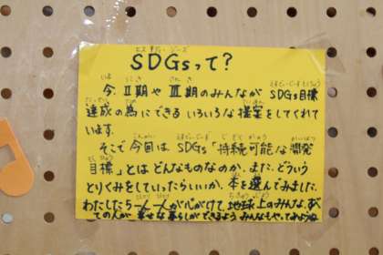 学校司書の先生によると,先日の2期・3期の児童生徒が行った「SDGs自由研究」のプレゼンを受け,持続可能な社会の実現という「現代の切迫した大きな課題」を,「低学年でもわかるように」という想いのもと制作した,とのことです。