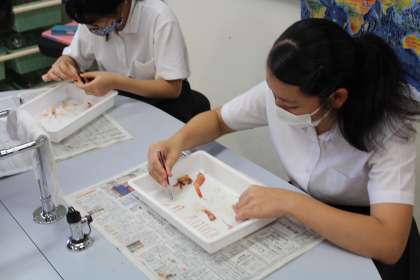 先日,ナナフシ(昆虫類)の観察を行った8年生の理科ですが,無セキツイ動物についての理解をさらに深めるため,2日(金)の授業ではエビとイカの解剖実習を行いました。