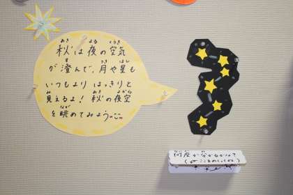 校務支援員さんが,秋から冬に向かう季節の流れを,掲示物で表現してくれました。