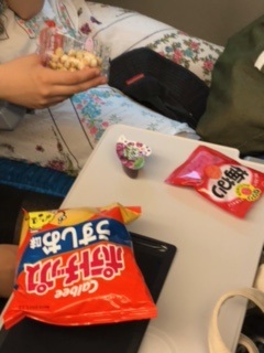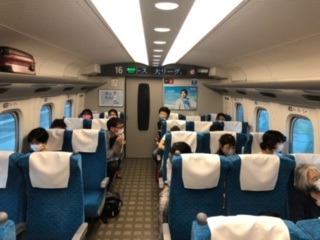 第1日目,のぞみ79号の車内にて,ぼちぼちと「おやつタイム」が始まりました。みんなおいしそうに食べています。