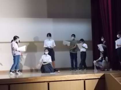 まだ台詞を覚えていないので脚本を持ちながらですが、さっそく自分の立ち位置なども考えながら読み合わせていきました。読んでは止め、読んでは止め…の繰り返しですが、7年生を中心に意見を出し合いながらすすめています。舞台で出演していない人からも積極的に発言があり、それぞれが責任を持って取り組んでいます。