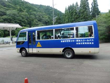 出発式の後,スクールバスロータリーからスクールバスで,花背山の家に向けて出発していきました。