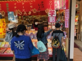 子どもたちが一番楽しみにしている宮島の表参道商店街での買い物タイムです。ここは,この学習旅行での最大のお土産スポットになっています。時間と予算との計算力が試されます。
