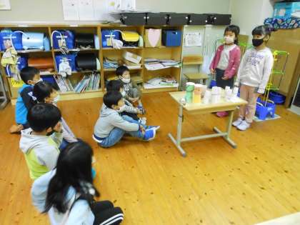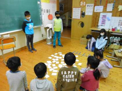 来週行われる新1年生の半日入学にむけて,1,2年生がそれぞれ新1年生に楽しんでもらうおもちゃを生活科で作りました。1年生は秋見つけで見つけた秋のものを使ったおもちゃ,2年生は廃品を使ったおもちゃです。2日に1,2年生合同で,それぞれのおもちゃで遊んで,さらに改良したらいいなというアドバイスを送り合いました。1年生は2年生から「落ちないように床でこまを回したらいいですよ。」「どこから投げるのか分かりやすいように線を引いたらいいですよ。」などのアドバイスをもらいました。2年生は1年生から「点数を数えるのは時間がかかるのでやめたらどうですか。」「ルールがよく分かりません。」などのアドバイスをもらいました。もらったアドバイスをもとに本番はさらに楽しく遊べたらいいですね。