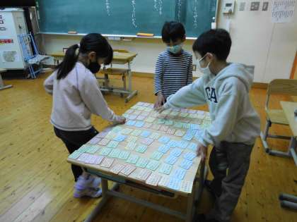 「百人一首って何?」という1年生も,1月にある百人一首大会に向けて,毎日練習を重ねています。2年生と一緒にやったり,学校司書の先生と対戦したりして,どんどん上手になってきています。当日は,一期は色別対抗戦,二期・三期は個人戦です。冬休みもおうちに百人一首があったら是非楽しんでみてください。
